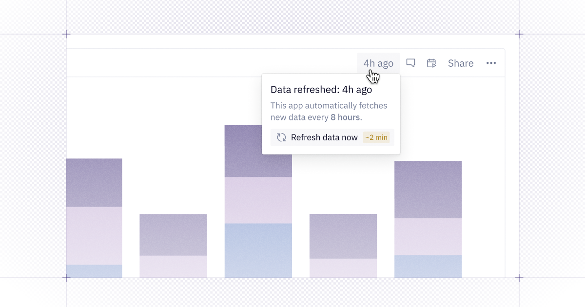 Most of the time, you want apps to reflect the latest data — and now they will. For new projects, the default is to auto-refresh published results: when someone clicks the refresh button, it updates the results for everyone, not just the person who ran it.