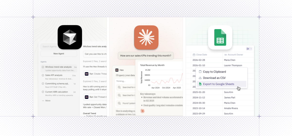 Whether you’re in Hex, using a spreadsheet, or collaborating with your colleagues, data should be there providing useful, relevant updates. Today, we’re excited to share an easy Google Sheets integration, a Cursor plugin, and the ability to bring more real-world context into your prompts by allowing the Hex Agent to accept text and image uploads. Lastly, check out the nice new streaming UX update for the agent.