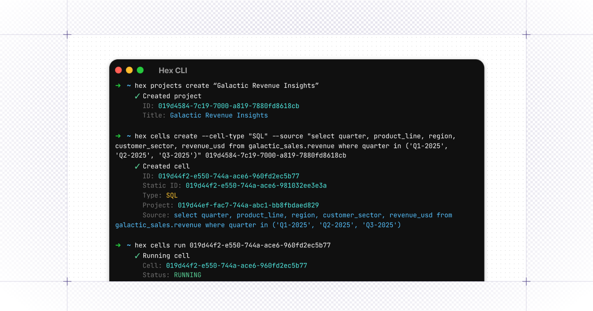 Today, we’re announcing the Hex Command Line Interface. Using the CLI, users (and agents like Claude Code) can create projects, write SQL, run analyses, and connect their agents…without leaving the terminal.