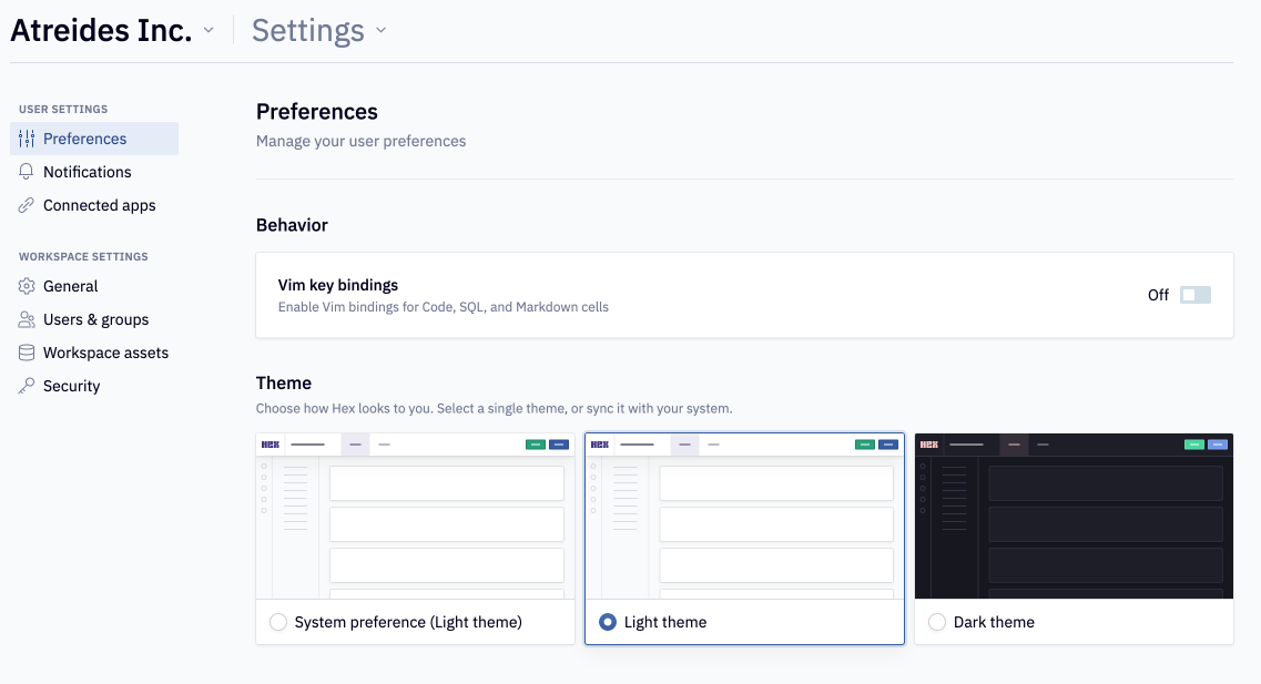 We’ve already covered most of the contents of the User preferences page, but expect more configuration options to become available here as we build. In addition to Theme settings, Vim key bindings are now available for Code, SQL, and Markdown cells.