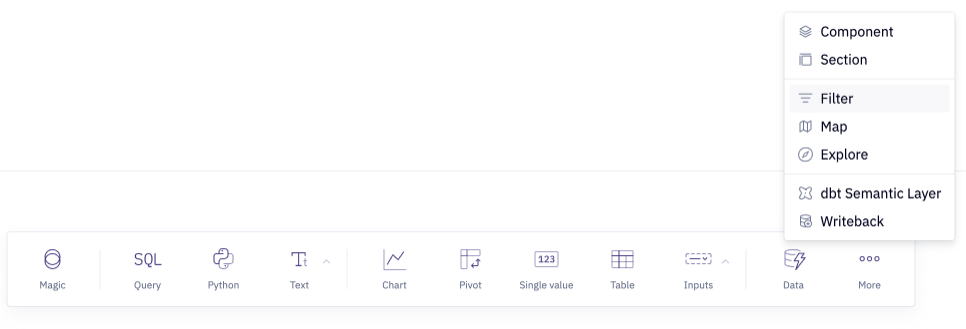 Filter cells work seamlessly with query results (i.e. the result a SQL cell that returns data in query mode), running the compiled SQL against your warehouse rather than filtering a dataframe in memory. This allows you to work with large datasets in Hex by leveraging the compute engine of your data warehouse.
